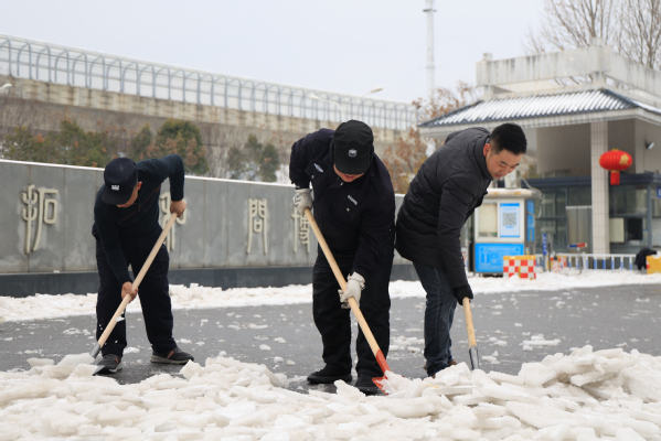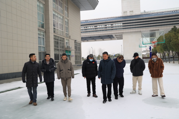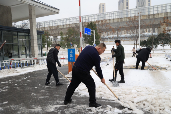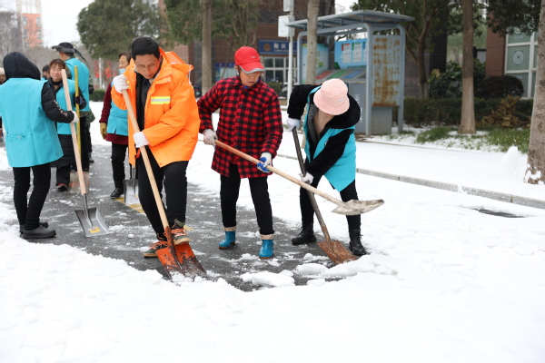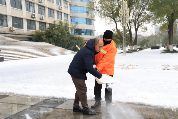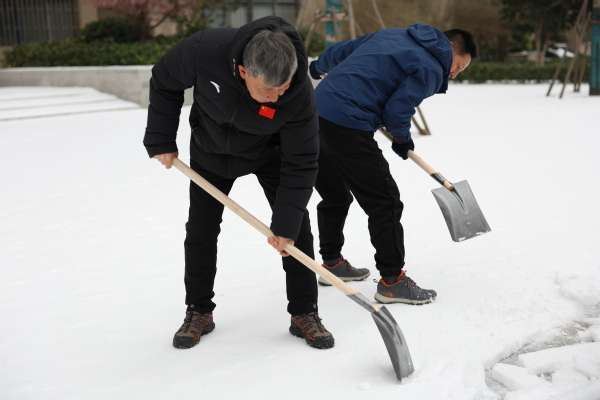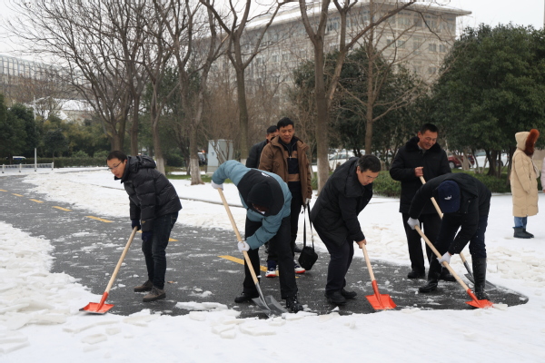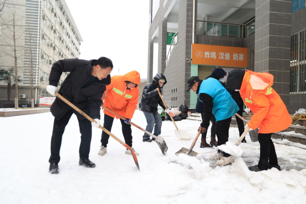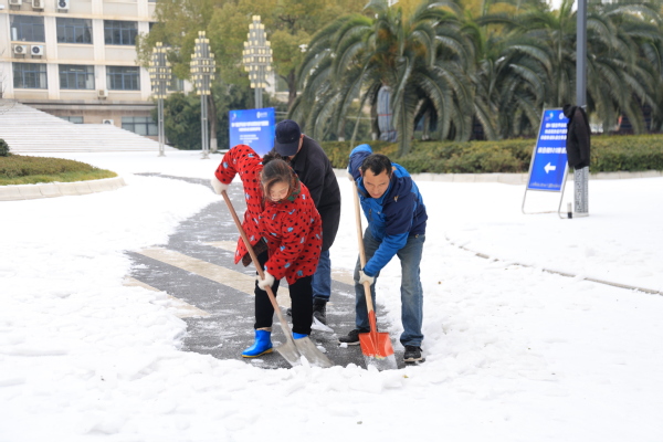 图为学校领导和教职工正在扫雪除冰、清除路障 摄影:芮雨欣 孙欢欢