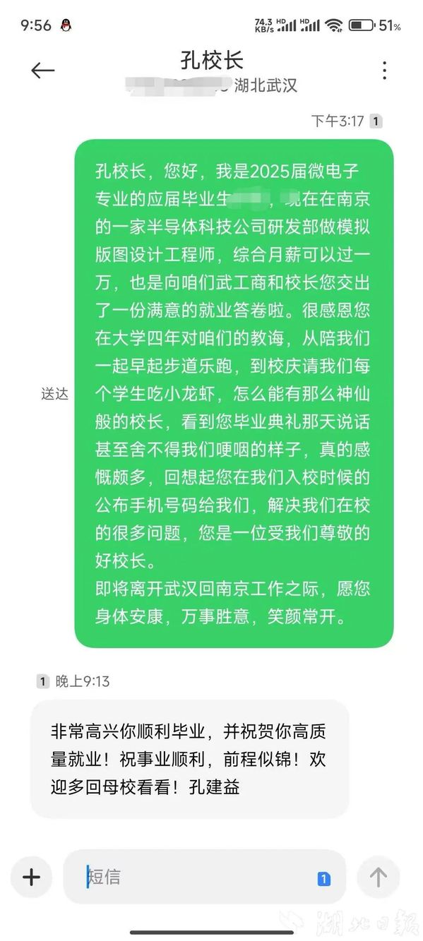不少毕业生给孔建益发短信