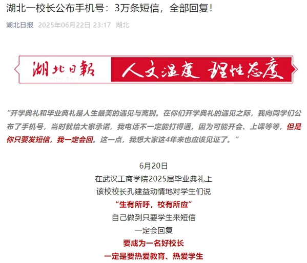 “开学典礼和毕业典礼是人生最美的遇见与离别。在你们开学典礼的遇见之际,我向同学们公布了手机号,当时就给大家承诺,我电话不一定能打得通,因为可能开会、上课等等,但是你只要发短信,我一定会回。这一点,我想大家这4年来也应该见证了。”