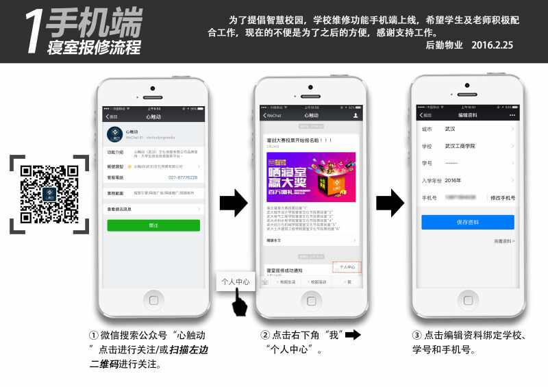 与以往不同的是,学生只需扫描二维码点击关注“心触动”,在左下角点击“校园生活”,选择“寝室报修”,完善自己的基本资料之后,即可填写自己所在的楼栋寝室号及报修内容,最后点击“提交报修”,就能完成报修登记工作。“心触动”平台将报修登记信息以短信的形式反馈到维修管理人员处,并提醒相对应片区的维修人员至寝室楼层进行维修。