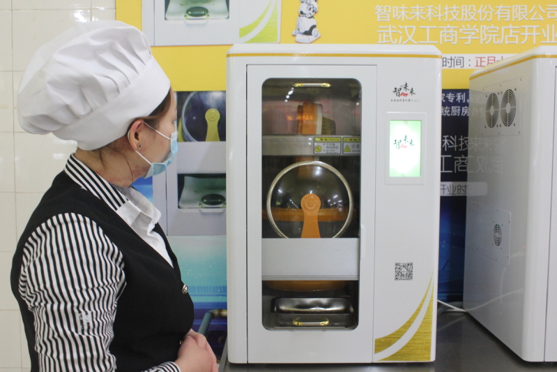 一位长相萌动的小小机器人,几台方方正正的炒菜机,工作人员只需要将标准配菜盒放入机器,选定菜名,轻触按键,三五分钟就给您带来智能出餐的神奇体验。