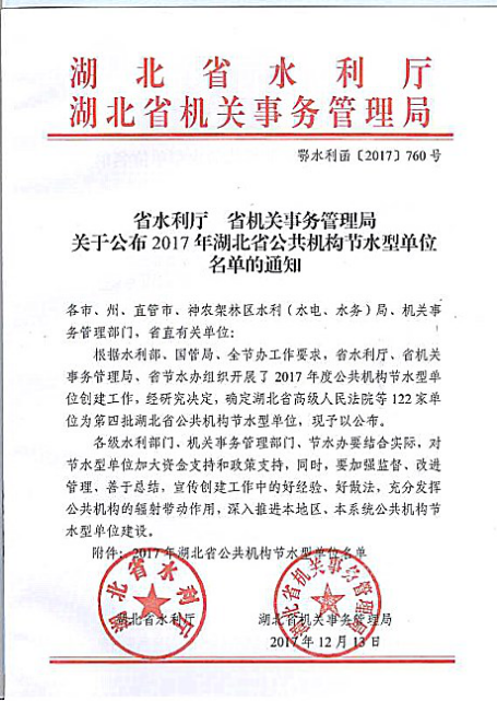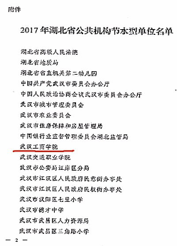 2017年12月13日,湖北省水利厅公布了2017年湖北省公共机构节水型单位名单,共有18个单位,我校光荣在列。