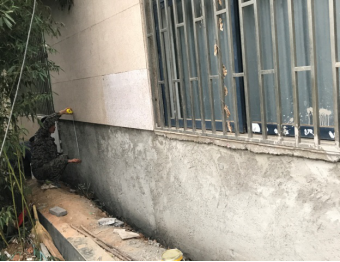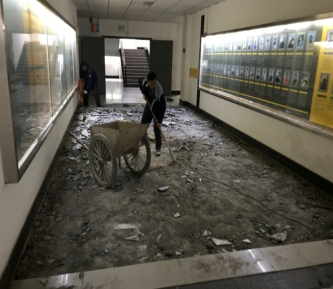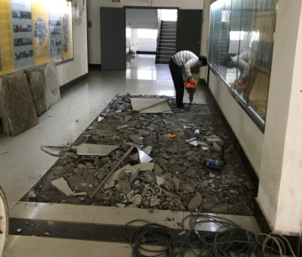 外语楼走道地砖维修(正在进行中)。外语楼走道因地砖控骨、地面下沉,将地砖挖起,重新粘贴。