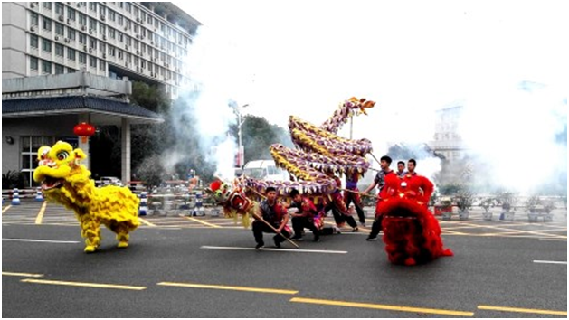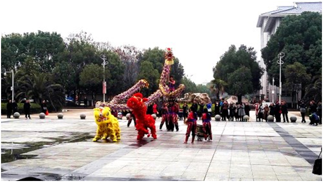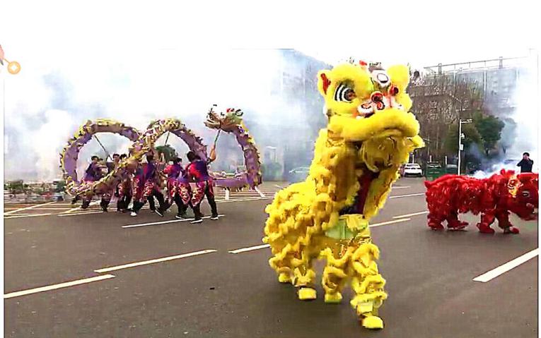 九点整,学校的舞龙舞狮表演正式开始。学校大门口礼花绽放,锣鼓喧天,龙狮齐舞,师生员工共聚一堂,表演到精彩之处,欢呼悦耳,掌声雷动。