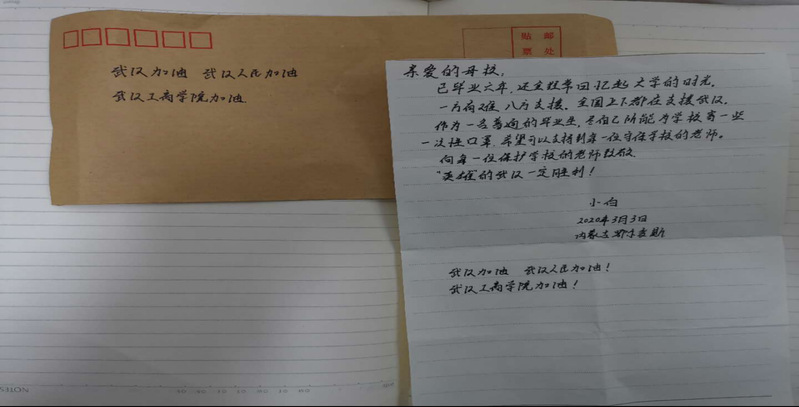 3月6日,后期管理部徐继安收到了这份情义无价的捐赠。小小的口罩,不仅彰显着校友“小白”的武汉工商“大爱”情义。我们坚信,在政府和学校的坚强领导和全体工商人的共同努力下,一定能够打赢这场疫情防控阻击战!