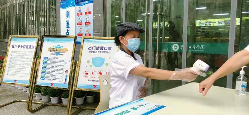为方便师生就餐,食堂外设置了专门的测温区和洗手区,学生到达食堂,需间隔且有序地排队,通过体温检测后,进行手部消毒,方可进入食堂有序选餐,此外,食堂实行进出口分离,堂食座位的分隔,分餐制等措施,降低疫情隐患。