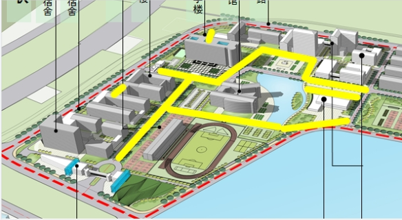 (1)综合楼、外语楼、图书馆、体育运动中心整个西区教学区;