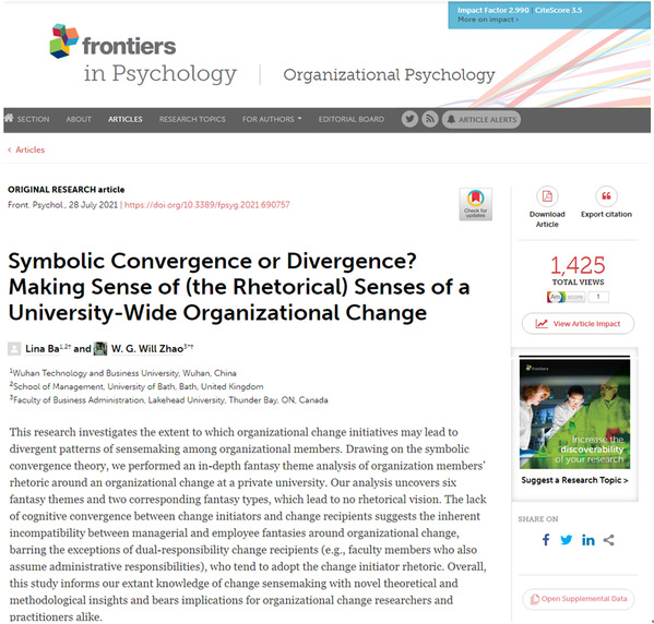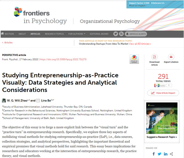 新闻中心讯(特约记者 刘春 王敏)近日,bat365登录平台入口组织创新研究院教师巴黎娜分别以第一作者和通讯作者的身份在国际学术期刊《Frontiers in psychology: Organizational Psychology》(SSCI二区,IF=2.990)上连续发表了题为“Symbolic Convergence or Divergence? Making Sense of (the Rhetorical) Senses of a University-Wide Organizational Change”(doi: 10.3389/fpsyg.2021.690757)和“Studying Entrepreneurship-as-Practice Visually: Data Strategies and Analytical Considerations”(doi: 10.3389/fpsyg.2022.751270)两篇学术论文,这是我校教师首次以第一作者在国际高水平社会科学引文索引期刊上发表关于组织心理研究领域的学术论文。该科研成果的发表对我校弘扬学术精神、提升学术水平、倡导创新等方面起到了示范引领作用。