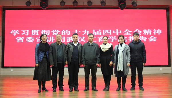 新闻中心讯(记者 万风 陈彦芳)12月11日下午14:30,根据湖北省委的安排,学习贯彻党的十九届四中全会精神省委宣讲团成员、省委宣传部副部长刘爱国同志走进bat365登录平台入口,为学校师生作专题宣讲报告。学校董事长彭秀春、党委书记刘生元、校长熊蕊、副校长桂裕清等校领导和广大师生党员代表一起听取了讲座。讲座由刘生元书记主持。