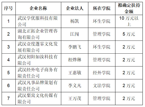 这七个项目分别是环生学院往届毕业生杨凯创办的武汉学优服科技有限公司、管理学院学生江闯创办的湖北正拓企业管理咨询有限公司、环生学院应届毕业生李鹏飞创办的武汉壹度蓬霏文化发展有限公司、管理学院学生程烨琳创办的武汉初阳如汝科技有限公司、经外学院学生王惠敏创办的武汉经外电子商务有限责任公司、文法学院学生李义凡创办的武汉凡事品牌策划有限责任公司、管理学院学生王万茂创办的武汉梨窝文化传媒有限公司。