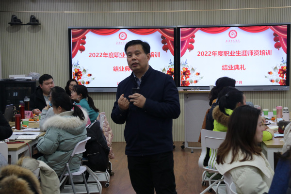 培训结业典礼上,赵北平副校长和朱若霞老师一同为参训老师们颁发了结业证书。赵北平副校长强调了此次培训的意义,他说:“此次特邀专家进校授课,是加强职业生涯规划和就业指导教师队伍建设,进一步推动师生职业生涯规划和就业指导服务专业化发展的重要举措,对提升学校总体就业指导工作水平,助力学生高质量就业将起到积极作用,希望老师们把培训学到的知识转化为可以熟练运用的专业技能,切实指导、帮助学生提升职业素养和就业指导能力”。
