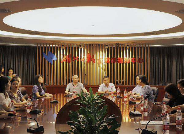 刘生元书记一行先后参观了荆楚网(湖北日报网)、楚天舆情数据研究院、湖北日报5G全媒体演播室、社史馆、编辑部、全媒体指挥中心等地,了解湖北日报全媒体运作的基本环境及运营模式。随后,与湖北日报编委、文化新闻中心主任孙国平,荆楚网董事长、总经理熊爱玲、调研员孔祥福、教育事业部主任黄培,湖北日报融媒体中心副主任唐晓煜、融媒体中心主编余宽宏,湖北日报广告经营中心地产商业事业部主编曹栗、湖北日报全媒体经营中心经济师周游、荆楚网舆情分析师熊露娟等开展座谈。其中,余宽宏、曹栗、周游、熊露娟均为学校文法学院校友。