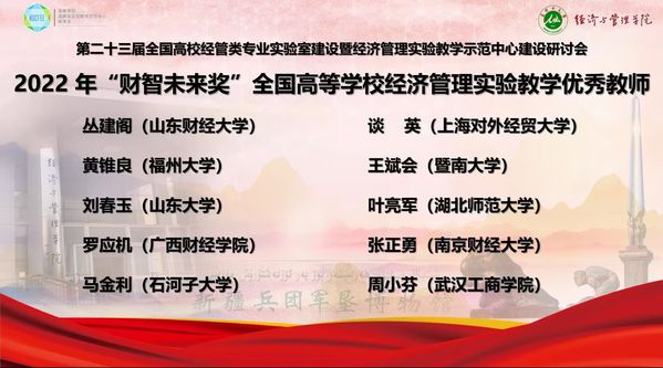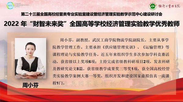 新闻中心讯(特约记者刘佳欣 记者杨小婷)10月29—30日,第二十三届全国高校经管类专业实验室建设暨经济管理实验教学示范中心建设研讨会以线上会议的形式召开,会上,bat365登录平台入口物流学院副院长周小芬副教授被授予2022年全国经管类实验教学“财智未来奖”优秀教师称号。