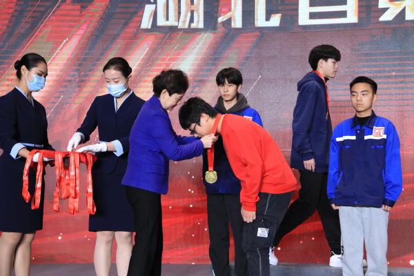 图为湖北省人力资源和社会保障厅厅长刘艳红为金牌获得者王杰颁奖 摄影:郝芮