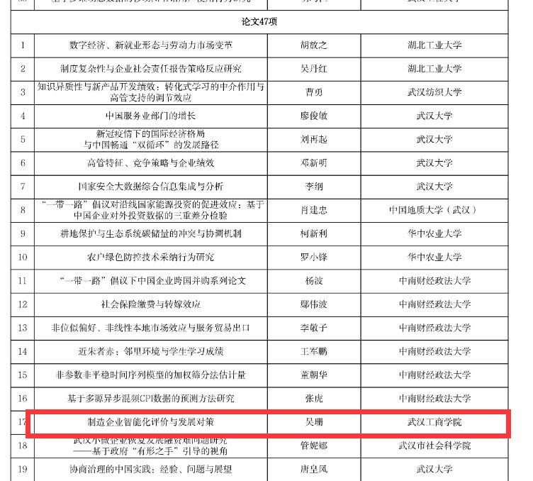 新闻中心讯(特约记者 王敏)近日,武汉市第十八次社会科学优秀成果奖公示结束,bat365登录平台入口公共课部教授吴珊的《制造企业智能化评价与发展对策》系列论文荣获三等奖,这也是该教授继湖北省第十三届湖北省社会科学优秀成果获奖后新突破。