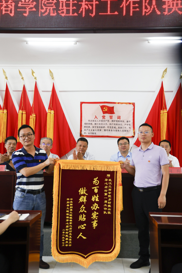 图为胡文庭委员代表当地向学校驻村工作队赠送锦旗 摄影:周逸文