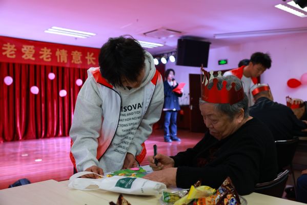 图为艺术与设计学院学生志愿者帮助老人签名留念 摄影:胡毅