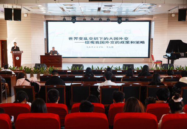 李纪明老师围绕“从冲突对抗中看我国的外交政策”“从大国博弈中看我国的外交智慧”“从与邻为善中看我国的大国担当”三方面,为学生们讲述了当今我国的外交政策和策略。他通过列举“俄乌冲突”“巴以冲突”等事件,指出中国政府对待冲突的态度所表现出的外交政策——坚定奉行独立自主的和平外交政策,并通过回顾我国与美国、德国、法国、巴西、澳大利亚、俄罗斯等国家在外交上的热点事件,告诉大家中国在与大国博弈中所展现出的两点具有前瞻性、与时俱进的外交智慧,即:一方面,表现出原则的坚定性,在国家领土、主权和发展等根本利益上决不让步;另一方面,在斗争策略上,充分展现出灵活性,既有斗争,又有联合,既有“硬杠”,又有“软泡”,既有正面交锋,又有旁敲侧击,既有坚决斗争,又有“度”的把握。