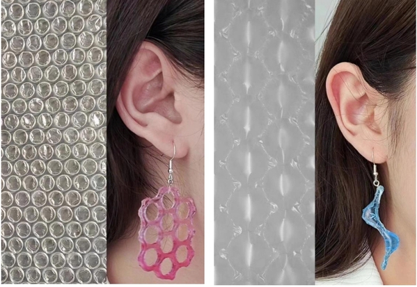 产品设计专业毕业生雷敏设计的《空气之间——“气泡膜”首饰系列》作品,灵感源于日常生活中的气泡膜,将平常被忽视的材料进行艺术化处理和再利用,转变为实用且美观的饰品。这一创新设计不仅彰显了物品多元价值的观念,也促使人们重新审视“价值”的意义。该作品由学院教师李培羽指导。