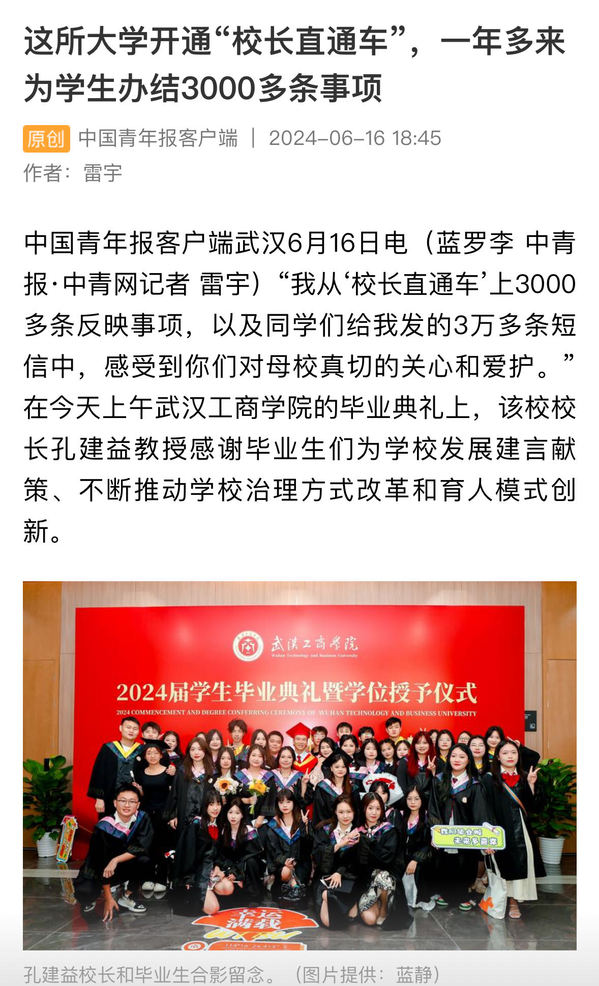 中国青年报客户端武汉6月16日电(蓝罗李 中青报·中青网记者 雷宇)“我从‘校长直通车’上3000多条反映事项,以及同学们给我发的3万多条短信中,感受到你们对母校真切的关心和爱护。”在今天上午bat365登录平台入口的毕业典礼上,该校校长孔建益教授感谢毕业生们为学校发展建言献策、不断推动学校治理方式改革和育人模式创新。