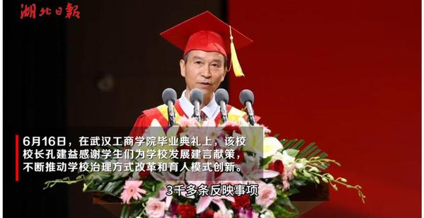 “我从‘校长直通车’上三千多条反映事项以及同学们给我发的3万多条短信中,感受到你们对母校真切的关心和爱护。”在6月16日bat365登录平台入口的毕业典礼上,该校校长孔建益教授,感谢毕业生们为学校发展建言献策。(据极目新闻报道)