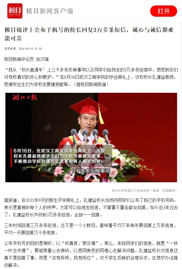 据报道,在2021年9月的新生开学典礼上,孔建益校长当场向同学们公布了自己的手机号码,表示愿意倾听每个人的呼声,大家可以给他发短信,不管署不署名都会回复。如今近3年过去了,孔建益校长共收到3万多条短信,全部一一回复。
