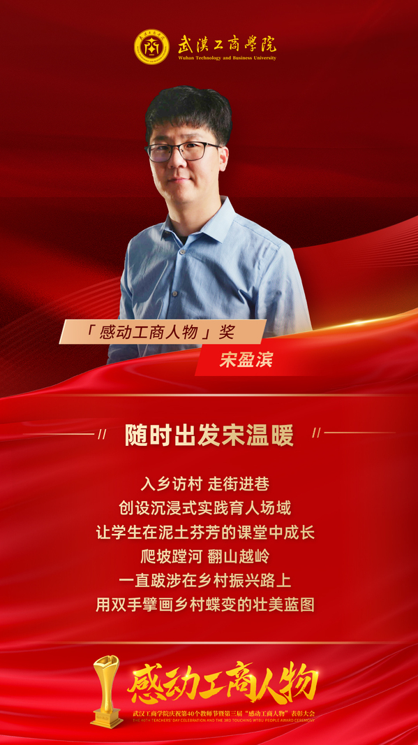 他,就是学校第三届“感动工商人物奖”获得者——艺术与设计学院院长助理、环境设计系主任宋盈滨,一个被学生亲切地称为“宋哥”“宋温暖”、被乡亲们唤作“冲锋衣老师”的85后大男孩, 2023年,他还获评“荆楚好老师”。