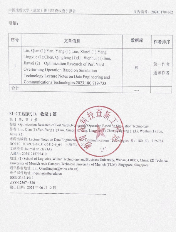 杨凌雪:我的论文《Optimization Research of Port Yard Overturning Operation Based on Simulation Technology》以湖北省重点规划建设的港口——黄石新港作为研究对象,探寻堆场翻箱技术优化的方法,为降低港口运营成本、提升效率、增强竞争力提供理论基础,进一步服务区域经济发展。在研究过程中,我觉得最困难的是构建模型。集装箱堆场作业随机性和动态性强,属于多层次排队复杂系统。在构建模拟模型时,需综合考虑众多因素,如不同运输方式下的货位安排、设备调度和运输路径优化等,要准确模拟这些复杂情况并进行合理分析,提出优化建议并非易事。