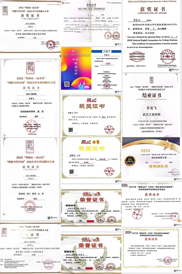 同年,齐龙飞在外研社·国才杯“理解当代中国”全国大学生外语能力大赛英语演讲赛项湖北省省赛200名选手中脱颖而出,斩获金奖,以湖北省第四名的成绩晋级全国总决赛,赴北京参赛,最终斩获全国银奖。