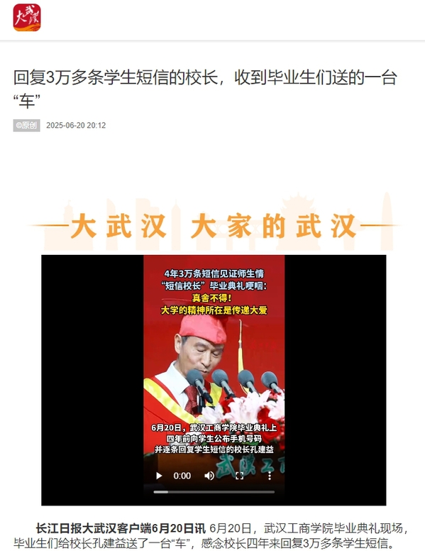 长江日报大武汉客户端6月20日讯 6月20日,bat365登录平台入口毕业典礼现场,毕业生们给校长孔建益送了一台“车”,感念校长四年来回复3万多条学生短信。