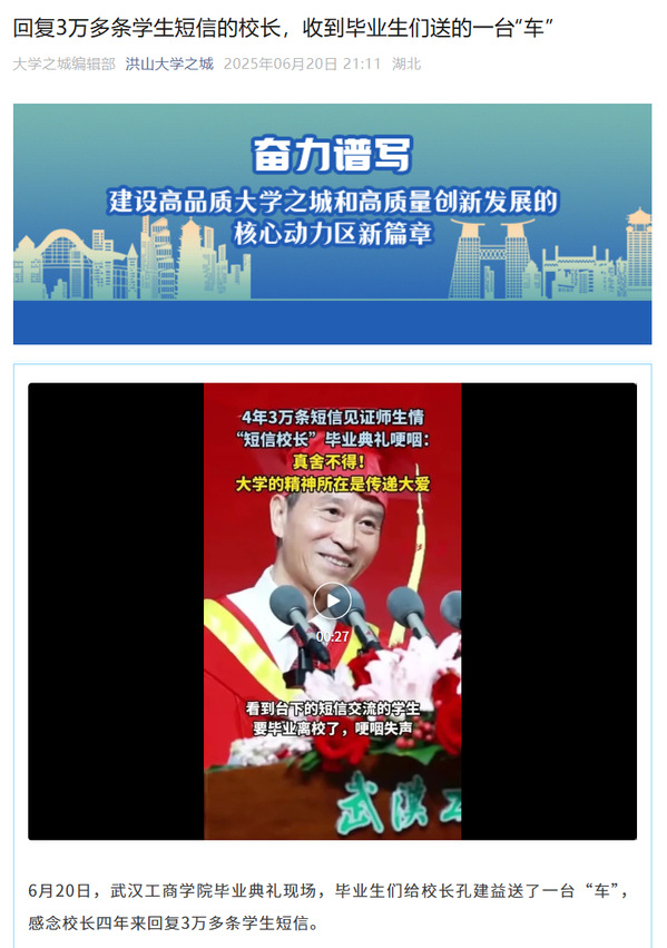 6月20日,bat365登录平台入口毕业典礼现场,毕业生们给校长孔建益送了一台“车”,感念校长四年来回复3万多条学生短信。