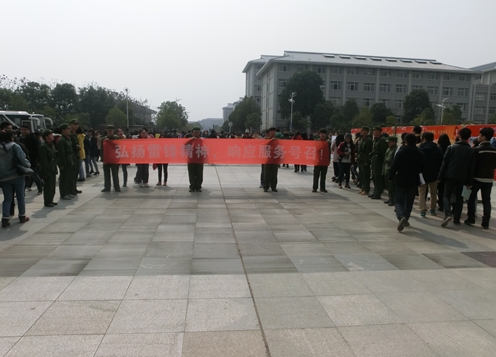 在活动当天校青协志愿者们就早上7:00集合,然后帮忙搬展板、张贴海报,布置会场。 中午12点时,在学校综合楼门前音响循环播放“学习雷锋好榜样”,并且志愿者们都身穿军装,以弘扬雷锋精神,还有相关人员对现场的同学进行宣传、以及讲解雷锋相关事迹并发放千纸鹤。晚上校青协的小伙伴们还在在综合楼帮忙打扫一楼到三楼的教室。以自身行动进行宣传。