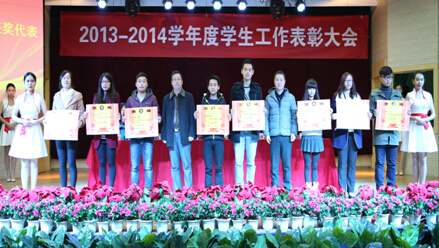 在雄壮的国歌声后,颁奖仪式拉开了序幕,首先由校长助理左宗文宣读了2013-2014学年度“先进班集体”、“三好学生”、“优秀学生干部”、“奖学金”以及“单项优秀奖”的表彰决定,随后,由校办公室主任张俊宣读了2013-2014学年度“暑期社会实践积极分子”的表彰决定。在表彰决定宣读完毕后,张金隆校长、人事部部长亓小林等参会领导依次为以上的获奖优秀个人和先进班级进行了颁奖。