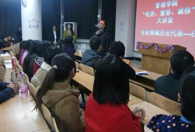 紧接着,石磊女士给在座的师生带来了一场《一步一个脚印-关于会计人才成长的思考》讲座。她概述了自己的职业生涯,从大学毕业初到电信公司再到一步步走到今天的位置。她说,工作要一步一个脚印,不能好高骛远,也不能挑肥拣瘦,要踏踏实实的从小事做起。首先要确定一个最现实的目标:在一个企业做最好的会计,把工作当成事业。石磊女士还强调了学习的重要性,知识是美好的,因为事务的内涵在不断变化,所以要不断学习,主动学习,在工作中学习,自己找机会学习。万丈高楼平地起,只有一点点的积累,才能使自身变得优秀。道理伴着石磊女士的亲身经历讲出,生动形象,发人深省。