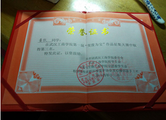 吴华杰在2014年由心愿创艺手工社,环境保护者协会,环境生物工程学院学生会联合举办的“变废为宝”比赛中荣获二等奖