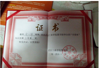 余小华在2014年由校图书馆“书香杯”知识竞赛中荣获三等奖。