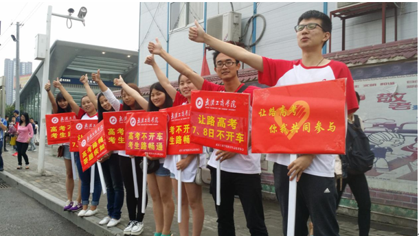 在活动前一天做好准备工作之后,6月4日活动当天下午志愿者们带着准备好的物资前往目的地——武昌火车站。志愿者们穿着会服,拿着上面写有“高考路畅通,答题疾如风”、“678,不开车”等字样的鲜红的宣传板走在路上的时候,便吸引了很多行人的关注。他们分散站在各个十字路口,很多在红灯前停留的司机都会看一眼那宣传板上的字,然后对他们微笑着点头。不仅如此,志愿者们还选择性问了在路边等绿灯的行人,他们对我们做这个活动的看法,很多人都表示赞同,认为这样的号召是有必要的。同时也问了一些司机,他们对这个活动作何看法,他们也表示这种号召很有必要,并且愿意在高考当天尽量少开车,为考生“让路”,为考生加油。活动进行到一半就下雨了,尽管下着雨,还有点寒风,但志愿者们还是坚守岗位。他们表示不管此次活动效果怎么样,只要有人关注,有人认可,这就是值得的。