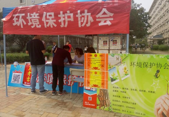 招新当天,环境保护协会采用横幅加展板的形式向新生介绍社团具体情况,同时协会设计了招新用的创意宣传单,简介社团各个部门的情况,而各位部长则是在招新处为2015级新生服务,解答新生的各种疑难问题。