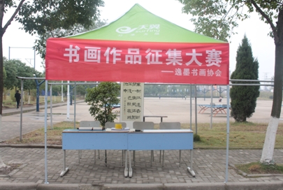 7:30分,书画协会的成员们顶着清晨的寒意,一同前往外语楼搬运物资,大家积极配合相互帮助,使原本劳累的工作弥漫着愉快的舒意,用高涨的热情驱散了冬季的寒冷。一顶帐篷,几件座椅,还有些许画作,就在在宿舍楼街道旁筑起了一座墨香四溢,画韵缭绕的”集雅小阁”。8:00左右,第一批值班的人员到位后,书画作品征集大赛就此开始。周末校园的早晨,鲜有人迹而清冷异常,两位值班的同学静坐于寒风之中,且听风吟;在方寸之间挥毫泼墨,行云流水。让现在备受冷落的传统书画焕发出别样绚丽的光彩,成为校园里一道独具特色的风景。十时左右,第二批值班的同学如约而至。依旧秉承一贯作风,在纸上书写精彩,向大家展示书画的魅力。于是,越来越多的人在这里驻足观赏,开始领略到传统书画之美,无不透露出对书画浓厚的兴趣。与此同时,参赛的书画作品也纷至沓来,这些作品水平优秀,各具特色,颇有百花齐放的景象,使此次大赛表现出一副欣欣向荣的局面,让众多参赛者能够更好的展示自己的才华和风。