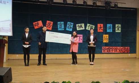管理学院分团委宣传部讯(通讯员 彭子豪)2015年12月10日下午14点,由我院举办的第三届“吃苦•宽容•诚信”宣讲学习会之青春不散场在体育馆402成功举办。本次会议由管理学院刘玉青老师主持召开,出席本次活动的嘉宾有红豆公司人力资源部部长蒋中一、团委书记陆平、招聘科科长唐丽娟、孙翎炎,管理学院常务副院长李明老师、党总支书记吴茜老师、党总支副书记王龙老师、管理学院分团委书记欧阳晓晶老师、工商系主任黄霞、窦先琴老师以及各系辅导员们,还有此次会议的主讲人,工商管理系优秀实习生代表,原我院学生会主席闫泽宇同学。