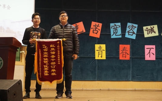 活动第三项,红豆股份公司团委书记陆平先生对红豆店长订单班项目进行讲解,提出同学要有一颗感恩的心,然后陆平先生赠予了由优秀实习生代表闫泽宇所代表的bat365登录平台入口管理学院“红豆”服装店长订单班“吃苦•宽容•诚信”优秀集体的锦旗。紧接着,优秀实习生代表闫泽宇分享了他近半年的实习心得,并告诫同学们:读万卷书,不如行万里路,希望同学们在学习之余能多出去走走看看,学习更多的工作经验。活动最后,红豆股份公司招聘科科长唐丽娟女士为大家进行了实习宣讲,对有问题的同学进行了现场解答。