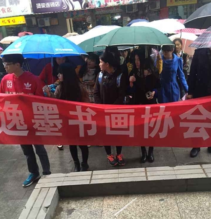 11月12日中午,所有社团于综合楼门口广场集合,进行社团活动月的千人游行活动。每个社团都按秩序站在各自的地方,跳完快闪后,排着整齐的队列,喊着响亮的口号,开始了社团活动月的游行。进入冬季的天气微冷,又飘着雨,同学们打着伞,却依旧迈着坚定的脚步穿过学校各个地方。风雨的呼啸不能阻止我们前进的步伐,长长的队伍成为校园的一道靓丽的风景线。协会的会长,部长、理事们都过来了,会长在队伍最前面,大声的发出口令:“我们的协会是——逸墨书画协会!”理事们也用最热情的声音回应,高喊口号:“逸墨书画,书香诗意。笔书乾坤,墨染苍穹!”活动中熙攘的人群将冷清的冬天塞个满怀,稀疏滴答的雨声,雄浑响亮的口号,协会的声音混合在各个社团之间。大家怀着对协会的热爱,大声喊出口号。协会随着游行的人流走过学校一条一条的主干道,走过整个校园,最后集合在一食堂前。在此,协会整理好队伍,再次高喊协会的口号,随后散去。