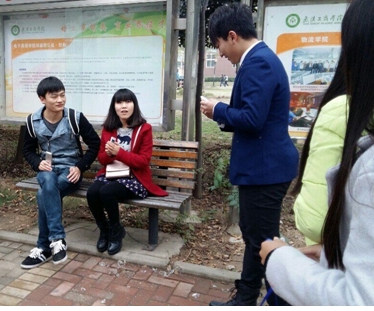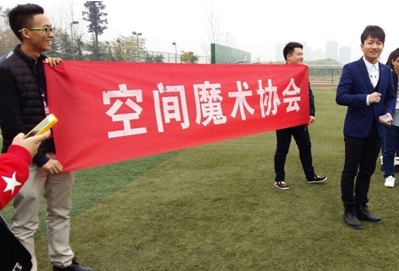 当日下午两点,校园街演活动正式开始了。队伍刚从综合楼前出发便在校园主干道上碰见了两位正坐在长椅上小憩的学生,说明来意后便开始了街演活动的第一个魔术,会长随手捡起地上的一个空瓶子,在观众的注视下将一块碎片放入瓶中,轻轻摇晃一阵后瓶子竟应声而碎!两位观众都露出了惊讶的表情、、、