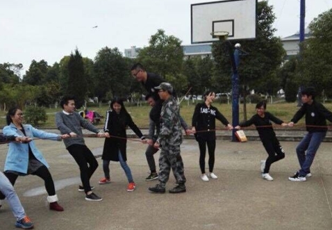 上图为众志成城游戏环节各参赛成员相互信任,相互依赖,用绳子围成一个圈,大家团结一致,小心的保持着绳子的韧度,成功的完成了这个比赛。