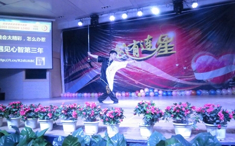 晚会开场前工作人员会分发荧光棒和拍手器。到了7:10,灯光一暗,黑白配的男女主持上台,拉开了晚会的序幕:第一个节目是舞蹈《LUV》,舞蹈演员们身著白衬衣小短裙,典型的校园风格,让人不禁想到电影中那些浪漫的校园故事;帅哥演唱的《恋爱ING》掀起了现场的第一轮高潮,观众们在台下都跟着唱了起来,还有妹子上台献花;《古典舞》的舞者身穿蓝白相间的舞衣,拿着扇子、彩带翩翩起舞,优雅的舞姿配合着古风古意的音乐,仿佛将观众带入了一段凄美的爱情故事,这时没有大声喧哗的人,直到演员谢幕,大家才开始尖叫鼓掌;《魔术表演》同样人气极高,表演道具铁环发出的清脆声响映衬着激昂澎湃的背景音乐,再次掀起了热潮,现场掌声不断,尖叫不断;《LIKE MONEY》舞蹈,演员们黑衣黑裤,动感、热辣的舞姿,高挑的身躯,同样是一道亮丽的风景;歌曲《终于等到你》,女生特有的清脆嗓音,温和感人的背景音效,一身白裙的的演唱者,引起一阵尖叫;话剧《白雪公主》, 颠覆了童年认知,夸张的剧情,幽默的语言,四川口音的魔镜和王后,王子和王后在一起的大结局,引得观众笑声不断;小品剧《天气预报》演员刚出场就引起观众的共鸣,“不准的《天气预报》骗了我19年”,接下来演员的各种吐槽,引得台下观众笑声连连;最后一个压轴节目是一段《中国武术表演》,先是拳术表演,表演者空翻、一字马、侧踢、横踢轮番上阵,引起惊呼阵阵,再是剑术表演,侧劈、横劈、前刺,招招干净利落,一气呵成,同时剑术表演动作还很优美,让人不禁自豪,中华武术真是将形与神完美结合。
