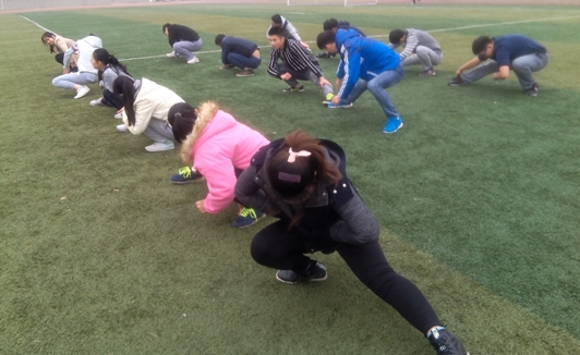 早上8:30,同学们便早早地来到操场集合。虽然学校周围空气存在着些许雾霾,但仍阻挡不住大家训练的热情。训练开始了,首先是围着操场小跑两圈的热身运动。经过简单地休息后,迎接着我们的是一系列的各种压腿压背运动,以锻炼同学们的柔韧性。然后是两次100米冲刺,来提高我们的出腿速度,为以后的腿法训练做准备。再接着是男生100米女生50米的蛙跳运动,锻炼我们的腿部肌肉力量。棍术练习过后,便是我们极具代表性的训练——实战训练了。在安全工作通通到位的前提下,同学们纷纷找到自己的对手一边切磋一边交流心得,把自己所学的咏春拳法与实际结合在一起,快拳强攻,切中路,快速闪躲,攻守结合等等,各种招式今人眼花缭乱。在同学的欢声笑语中,也将咏春拳法发挥到了极致。