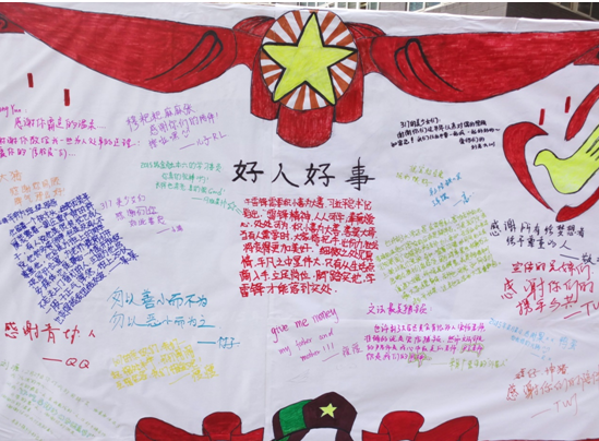 开幕式现场,青协人员佩戴工作牌站在各个招募点介绍旁边,为来往学生热心解答。来往的学生也热情高涨,积极询问活动的具体内容,踊跃报名。中午12点,青协在学校分了三个地点同时开始快闪,一边跳着惊艳的舞蹈,一边着个性的服装吸引路过的学生。还有一群人高喊着“雷锋之月,你我同行。快快加入青协,一起弘扬雷锋精神,参加志愿活动吧!”午饭过后,学生们一边报名一边写下自己经历的好人好事,本来一块空白的展板也被陆陆续续经过的学生填满了。