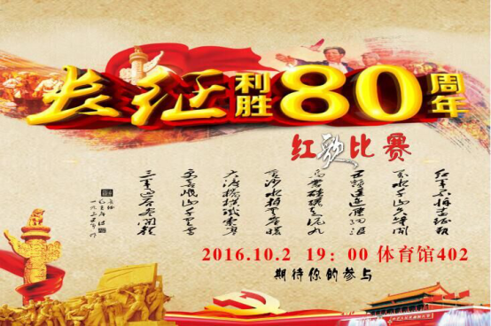 为丰富和加深对红军长征的了解和认识,学习长征精神,弘扬红军长征精神,继承和发扬革命先辈的光荣传统。在活动中感受长征精神的伟大,红军的伟大,祖国的伟大特在学校的体育馆402举行“长征胜利八十周年”歌咏比赛。比赛定于2016年10月22日19:00体育馆402 !欢迎广大师生前来观看。