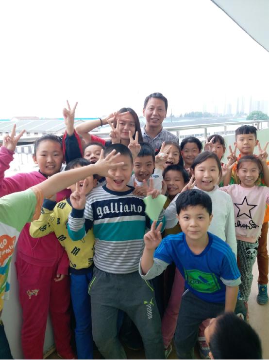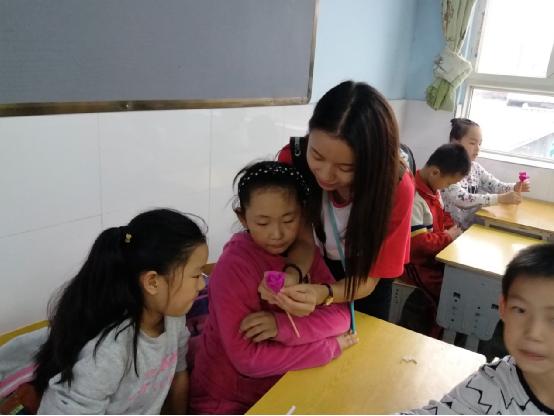 嘀嗒嘀嗒嘀嗒嘀……下课的音乐声响起了。原本很安静的走廊开始变得喧闹,一群群可爱的孩子们向志愿者们欢乐的奔跑过来。七位志愿者们一边拿着手工工具和材料一边拉着孩子们可爱的小手一起走进教室。在班主任的指导下孩子们迅速的端坐整齐。广播开始响起眼保健操的旋律,孩子们专注着听着广播,做着眼保健操。随后志愿者们七位志愿者各自分配好工作任务,两位志愿者在讲台上进行指导,四位志愿者在孩子们身边进行辅导,剩下的一位志愿者负责对整个支教活动拍照。在教孩子们编制玫瑰的时候,孩子们都很积极也很活跃。伴随着志愿者们细心的教导下一朵朵绚丽的玫瑰花陆陆续续的编制完成,保证每一位孩子的手上都有一朵美丽的玫瑰花,最后志愿者们与所有的孩子们进行了集体合照。