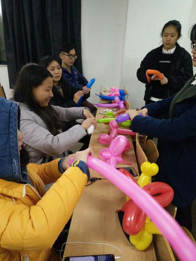 第二部分是心缘创艺手工社趣味授课之“魔术气球”。本次授课的内容为“魔术气球”。所谓的魔术气球,就是用气球做出各种各样的有特色的东西。本活动的授课内容有:气球小狗、气球花、气球小熊、气球天鹅。授课的开始是由各部门部长分发材料(彩色气球、打气筒)。再由艺能部教授“魔术气球”的制作方法。理事会员们个个都精神满满,迫不及待地想要一展身手。就这样,一个个精彩的作品在他们的手中诞生了。本次活动让他们的手工生涯更加丰富,生活更加精彩,也让这些朝夕相处的伙伴们更加团结,友谊日渐增进,最重要的是让手工社成员们懂得了手工的真正意义。